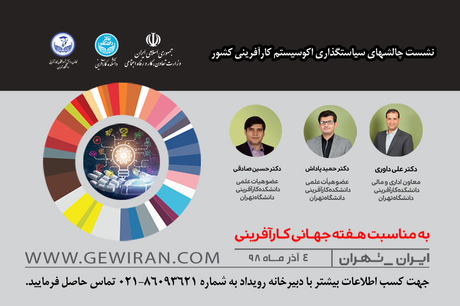 در این نشست که با حضور دکتر علی داوری (عضو هیأت علمی و معاون اداری و مالی دانشکده کارآفرینی دانشگاه تهران)، دکتر حمید پاداش (عضو هیات علمی دانشکده کارآفرینی دانشگاه تهران)، و دکتر حسین صادقی (عضو هیات علمی دانشکده کارآفرینی دانشگاه تهران) برگزار خواهد شد؛ چالشهای سیاستگذاری اکوسیستم کارآفرینی کشور مورد بررسی قرار خواهد گرفت.